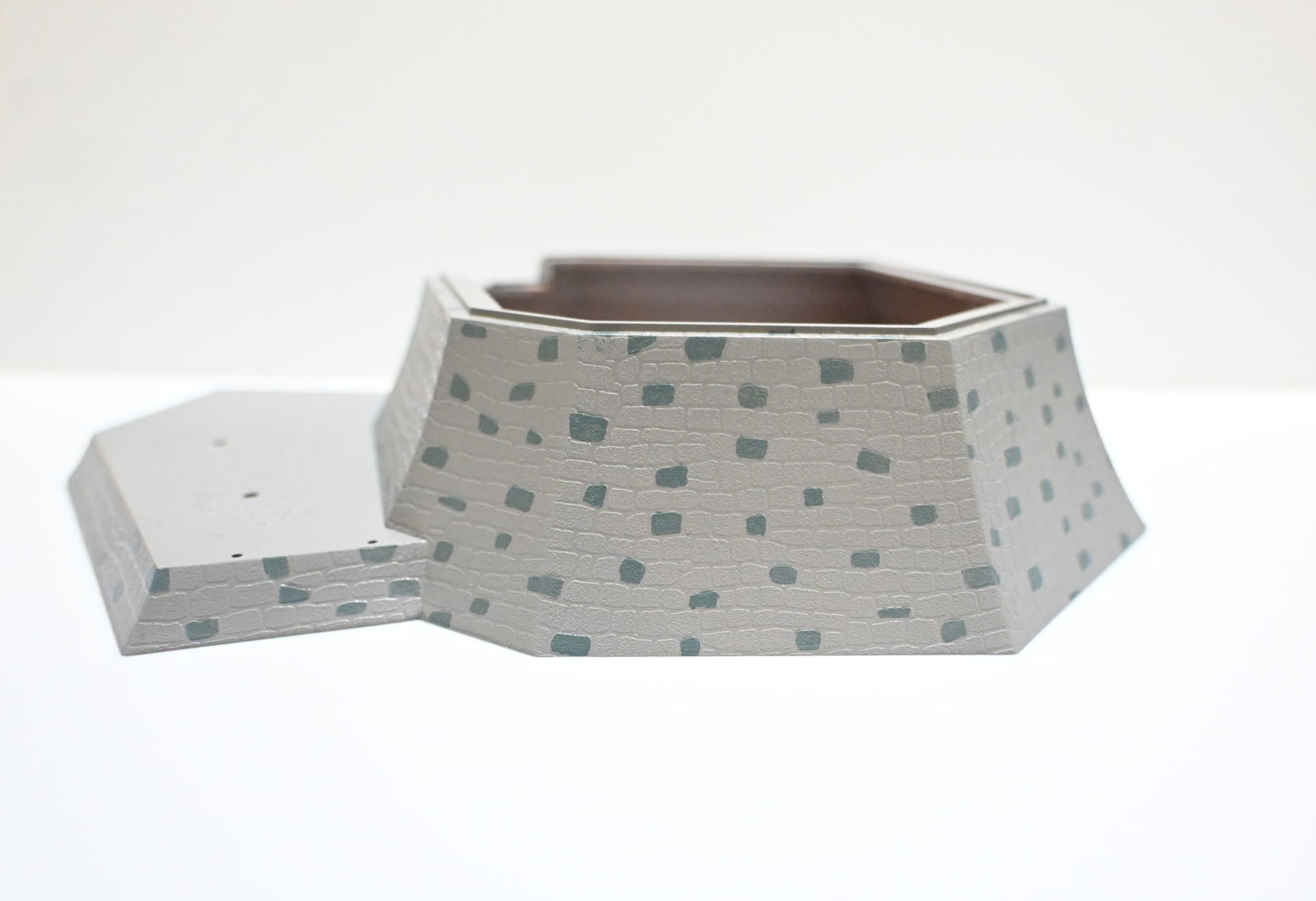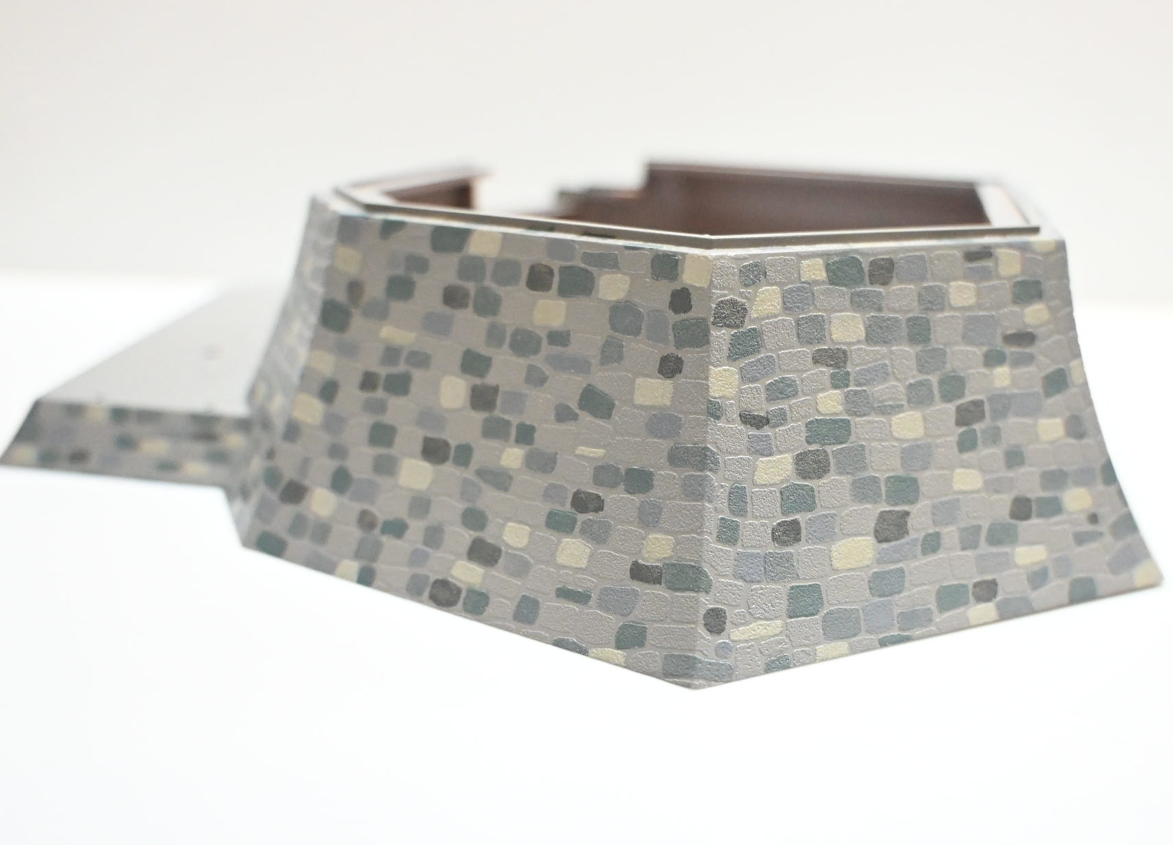 色々な色が混同した石垣に薄くクリアーブラックを吹き付ける事によってまとまり感が出ると同時にエッジ部を黒くする事で重量感が出るようにしました。